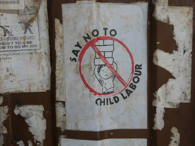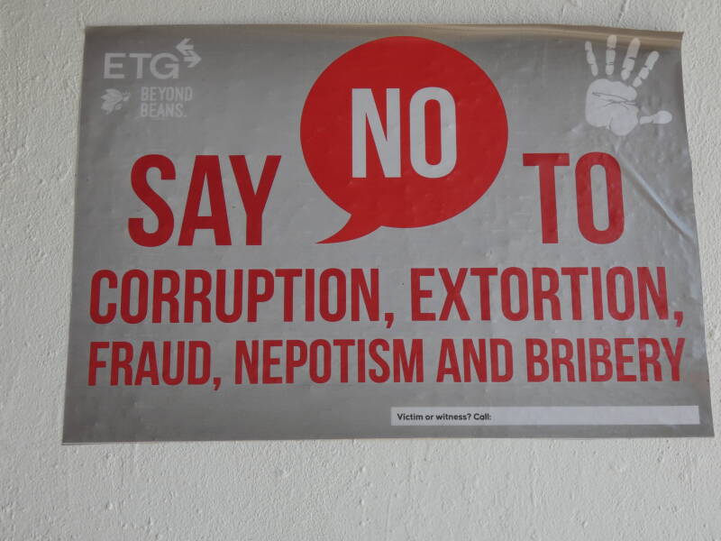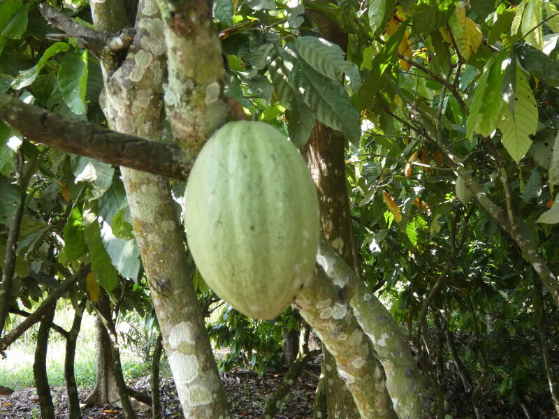 Eventually we were back out into the lush green vegetation and rolling hills, with frequent small towns and villages. We stopped to look at some casava plants and some cocoa trees at the side of the road, and then a mile or so further on we stopped briefly at a cocoa bean packaging plant. They have very strong policies on fair treatment for employees, which was evidenced by the numerous posters on the walls.