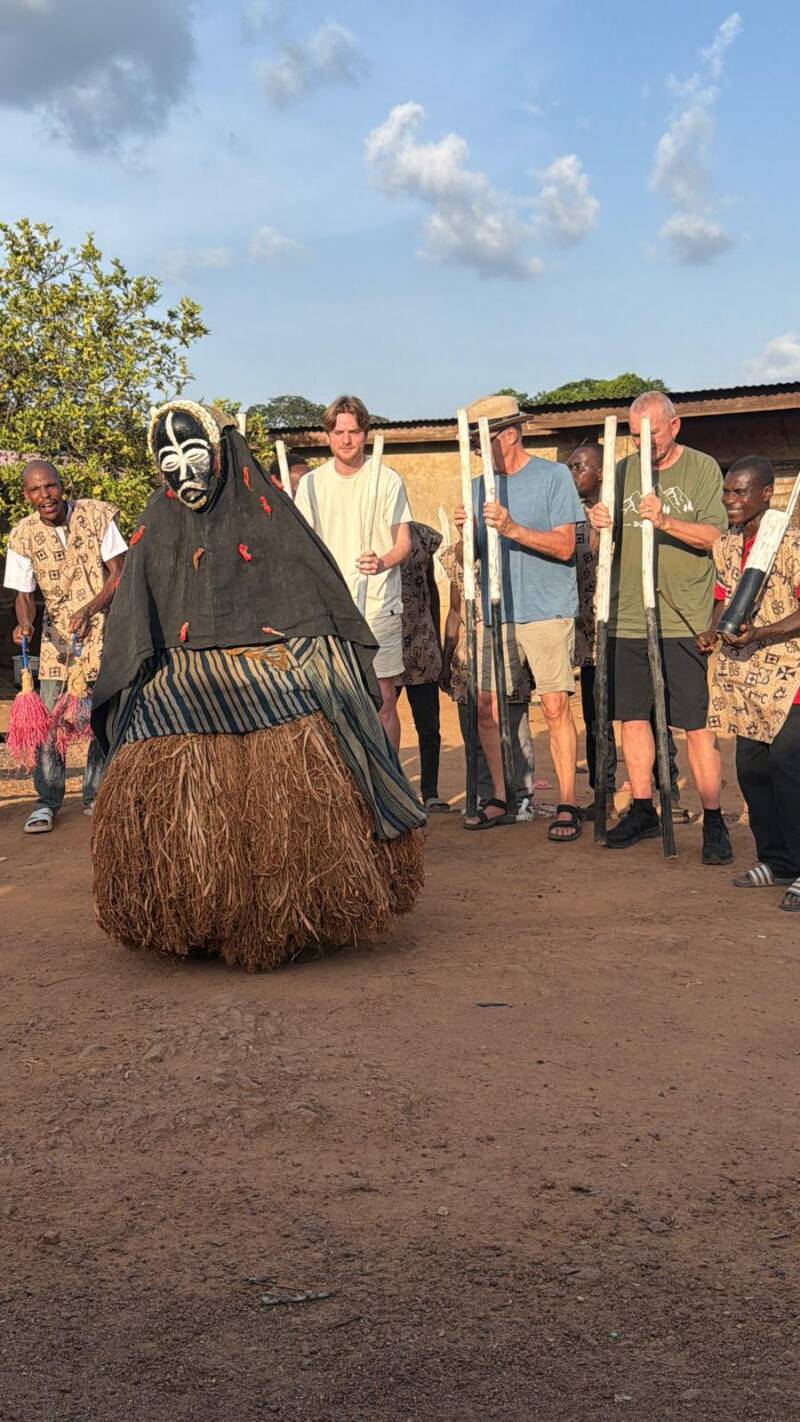 During the ceremony the mask greeted us the males, by shaking hands, but the culture does not allow for the mask to touch females. Also, kids being uninitiated, cannot be touched or they will be cursed, so the kids all ran away when the mask came near them.