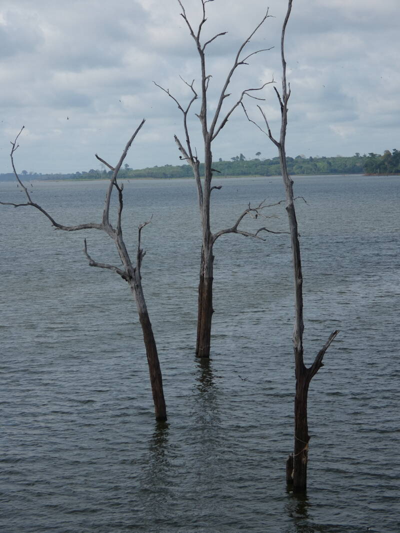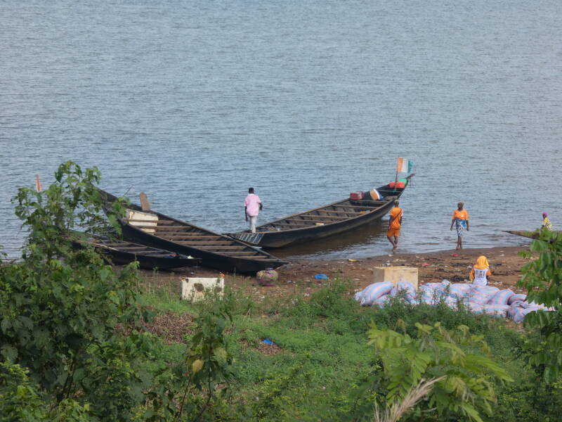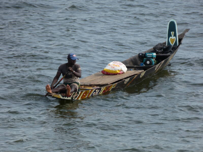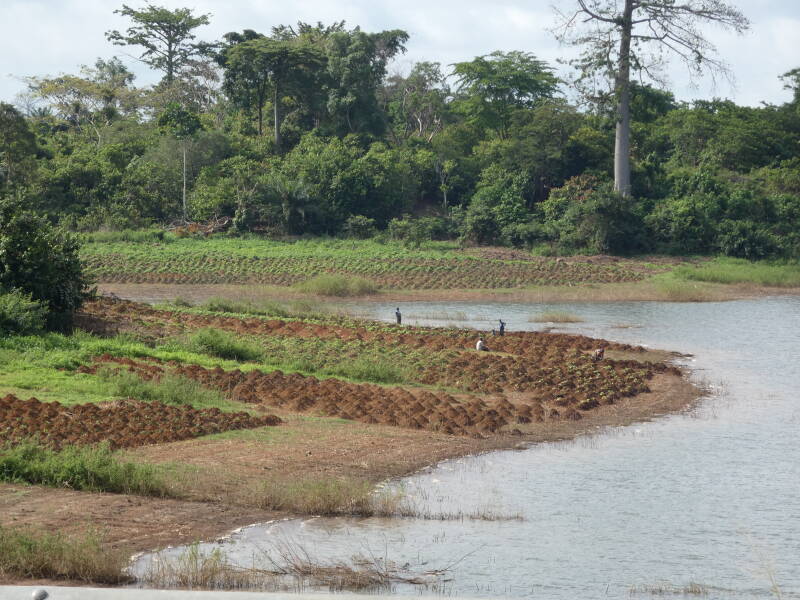 Once out of the city, the landscape became green and lush. The road surface remained good, and the traffic light. We passed though rice fields, then rubber plantations and cocoa plantations. The rainy season is due to start here in April but there are signs it might be earlier. At one point we came to a large river Sassandra where there were some fishermen working, and we decided to walk over the bridge to get a better look.