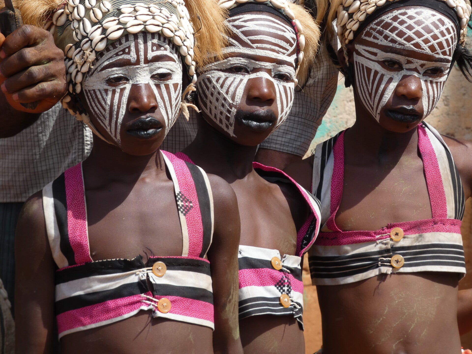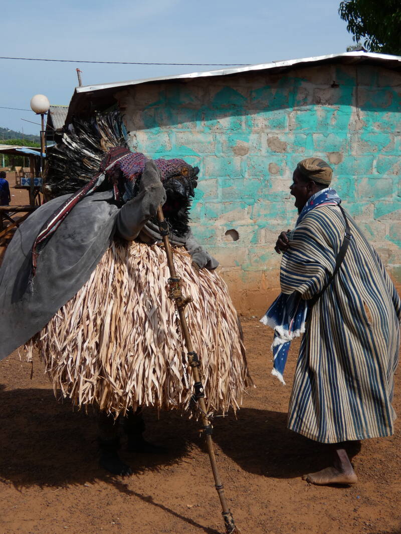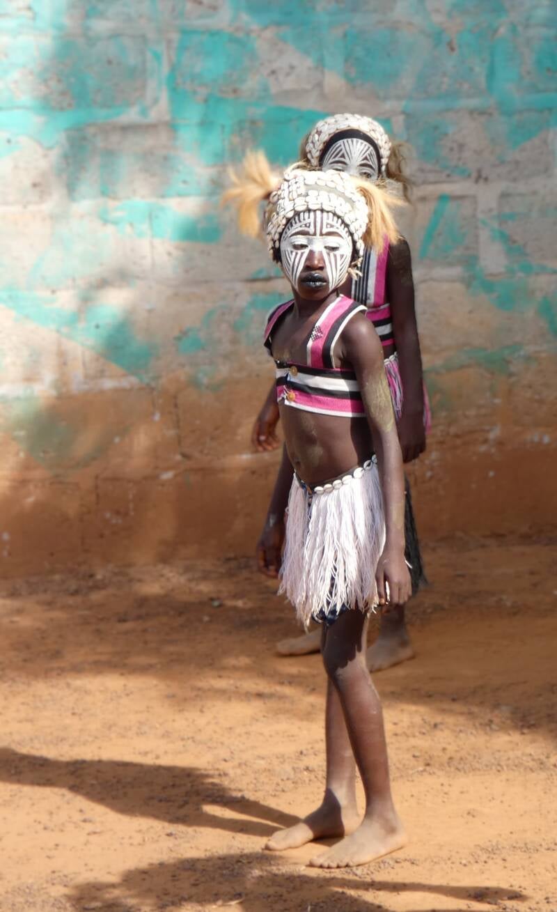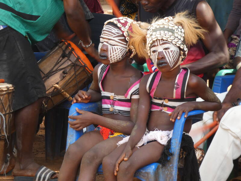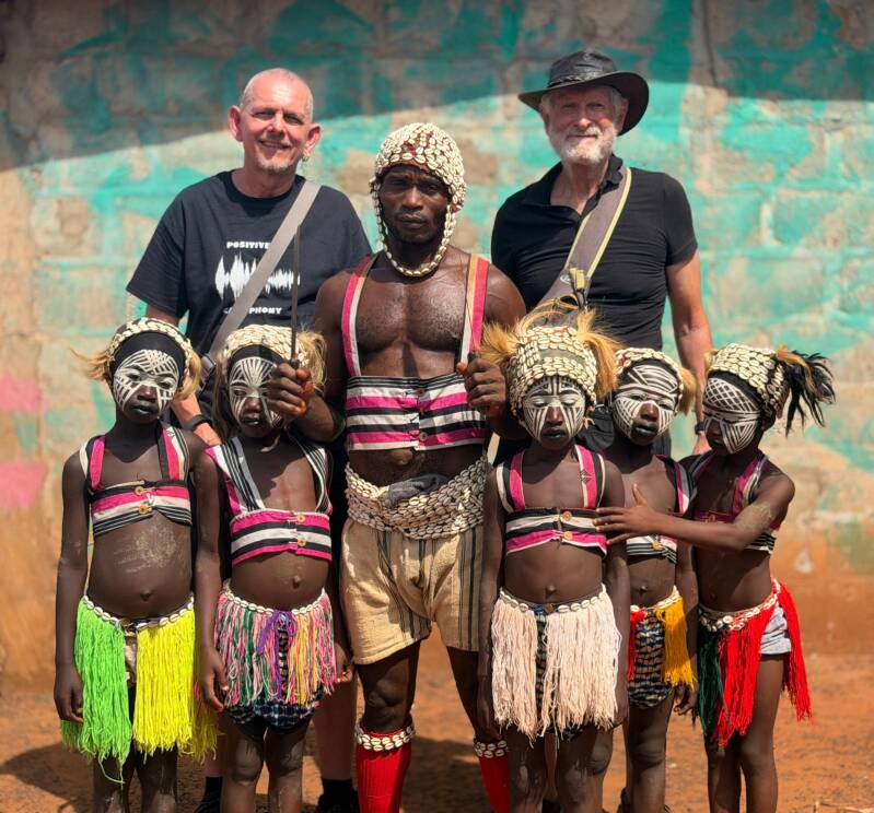 We finally arrived at the village to hear the sound of drums and percussion. Although we have now seen several tribal ceremonies in four different countries, I never get tired of them. This one was a bit different again. The main purpose is to form part of an initiation ceremony for young girls to eventually become priests, and advise the village on spiritual matters. The girls were about eight or nine and had white masks painted on their faces. They would all be dancing, then one would break away and run to a guy with bells tied round his legs, who reminded me a bit of a Morris dancer, and they would fling themselves into his arms. He would then variously fling them in the air, allow them to contort themselves whilst he held them, or lift them high above his head, and twirl them around. He appeared to be a kind of master of ceremonies.