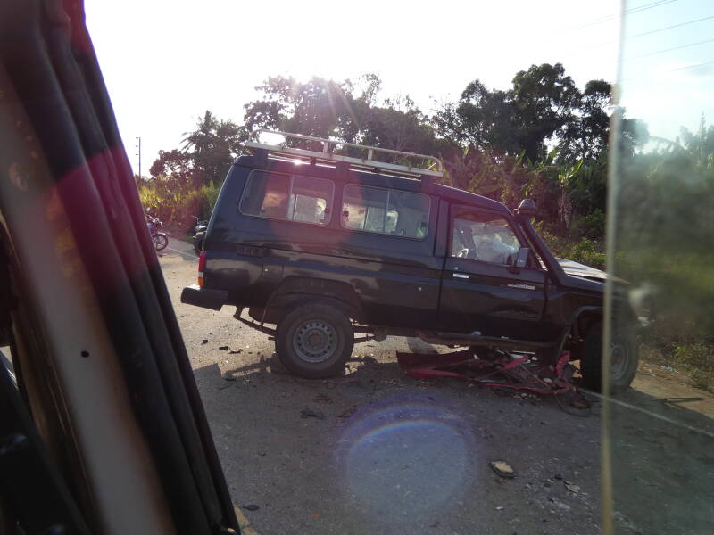 After about an hour we stopped at a police checkpoint. Whilst they were checking out papers, we had a beer at the checkpoint bar, very civilised. Shortly after setting off again, we came across a serious looking accident which appeared to be a head on collision between two cars. There are actually very few cars on the road here. Mostly motorbikes, a lot of whom ride with an umbrella to protect from the sun, although they do not wear helmets here.