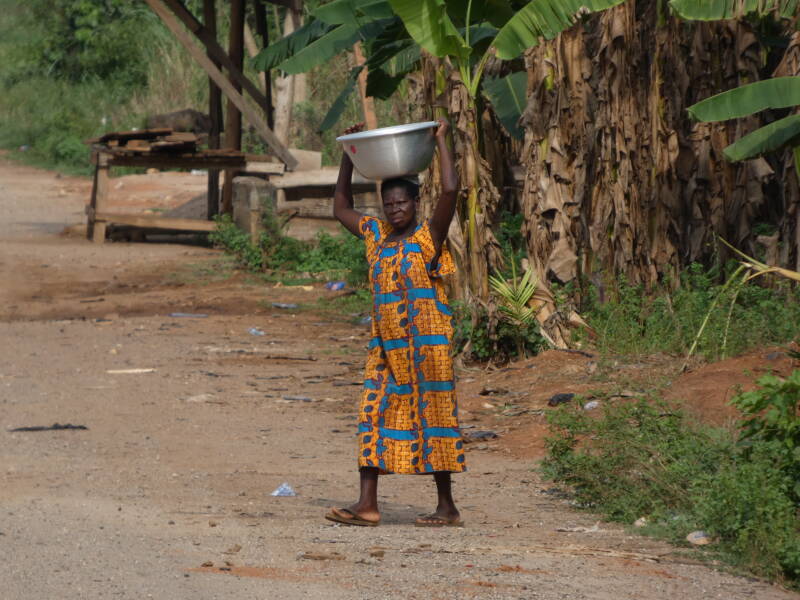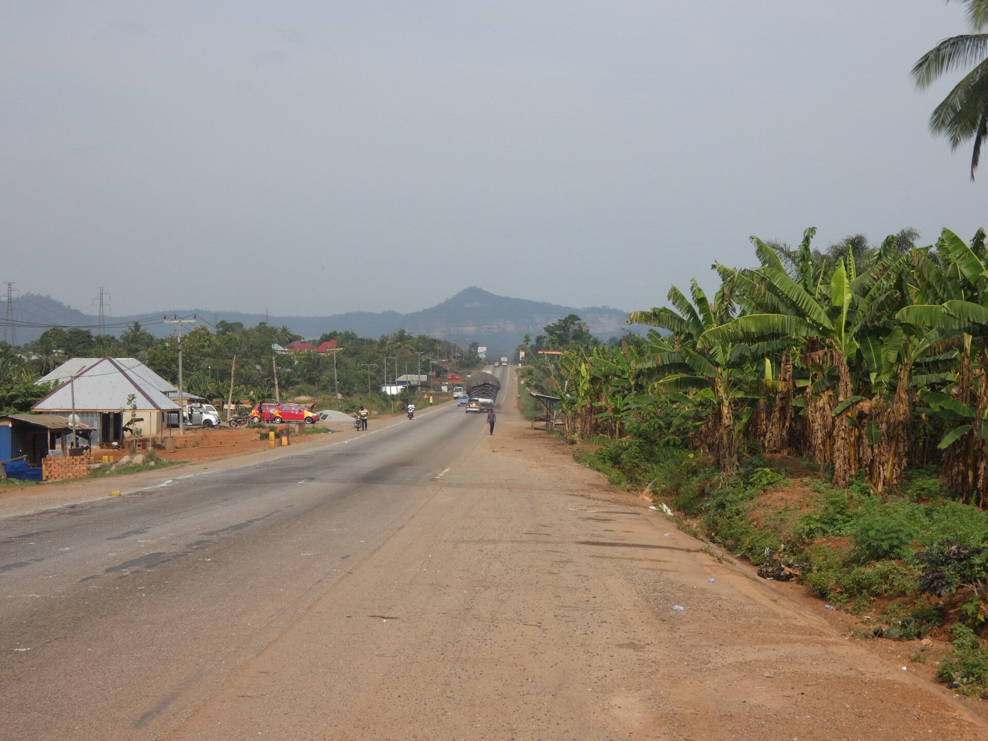 Suddenly we were free from Accra, and the landscape started to change. Small hills started to appear green with vegetation and palm trees, and dotted with houses and villages. It was great to be free of the city traffic, but there were still a lot of trucks as the road we were on the road that eventually goes to the northern border with Burkina Faso.